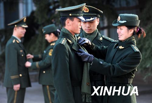11月10日,青島公安邊防支隊官兵正在試穿07式冬季軍服。當(dāng)日,武警山東總隊、山東公安邊防總隊開始換發(fā)武警07式冬季軍服。新款冬裝分為冬常服、常服大衣和制式毛衣,均為深橄欖綠色,冬常服由關(guān)領(lǐng)改為開領(lǐng),毛上衣可佩戴肩章作外衣穿著,軍官常服大衣可佩戴圍巾。新華社記者 李紫恒攝
