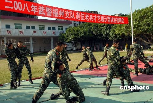 11月20日,武警福建福州支隊(duì)退伍兵專場(chǎng)招聘會(huì)在福州舉行。來自福州市的近20家用人單位來到招聘會(huì)現(xiàn)場(chǎng),推出了微機(jī)操作、保安、公安戰(zhàn)線警務(wù)人員、物業(yè)、駕駛員、廚師等300多個(gè)工作崗位,供350多名即將退伍的老兵選擇。招聘會(huì)現(xiàn)場(chǎng),退伍老兵通過軍事技能、電腦操作等才藝展示,面對(duì)面與用人單位溝通交流。中新社發(fā) 李濤 攝