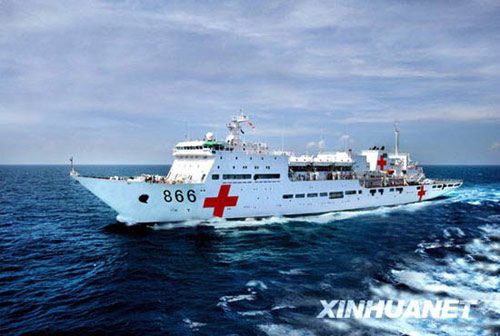 2008年12月22日,浙江舟山,我國自主設計、建造的首艘大型專業(yè)醫(yī)院船,也是世界上第一艘大型專業(yè)醫(yī)院船---866岱山島船命名授旗,開始在海軍服役。