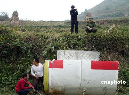 10月26日下午6時,長征三號甲運載火箭殘骸外殼已拆卸完畢,有關部門在組織交通車輛和人員裝載回收。10月24日18時05分,我國在西昌衛星發射中心用長征三號甲運載火箭將嫦娥一號成功送入太空。18時16分火箭殘骸安全按計劃墜落在貴州預定范圍。殘骸落于一民房,殘骸外殼落于玉米地,無人員受傷。中新社發 易勝武 攝