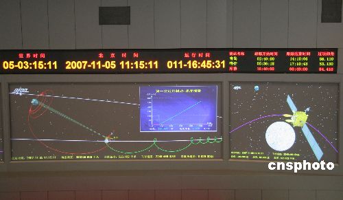 北京時間11月5日11時37分,北京航天飛行控制中心對“嫦娥一號”衛星成功實施了第一次近月制動,順利完成第一次“太空剎車減速”動作,月球捕獲衛星。“嫦娥一號”順利進入環月軌道,成為中國第一顆月球衛星。中新社發 孫自法 攝