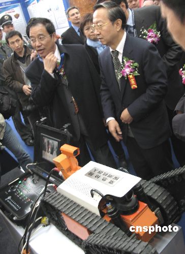 11月6日上午,“第十二屆中國國際煤炭采礦技術交流及設備展覽會”在北京全國農業展覽館開幕。開幕式上,中國國家安全監督管理總局局長李毅中來到1號展廳,在中國研制的首臺“緊急搶險探測機器人”前,詢問有關技術指標。這臺由哈工大機器人研究所與唐山開誠公司共同研制的有線遙控機器人,可以在遇難、遇險礦井中行走500米距離,并可以爬坡、越障,到達指定地點,并探測井下有毒氣體、溫度、風速數據,對遇險礦工地段進行探測救險。中新社發 鄒憲 攝