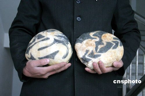十一月十九日,河南伊川一奇石愛好者展示其收藏的兩塊有“龍”、“鶴”圖案的奇特石頭。據介紹,這位奇石愛好者最近在伊河灘撿到兩塊奇特的石頭,兩塊石頭均呈青灰色,大小相近,高約三十厘米、寬約二十厘米、厚約五厘米。一塊正面圖形酷似蛟龍,背面像北京奧運會舞動的“京”字會徽;另一塊正面圖案如同兩只嬉戲的仙鶴,背面則顯現出一副抽象的山水圖。兩塊奇石上的圖案惟妙惟肖、形象逼真。經地質專家徐海龍鑒定,確認這兩塊奇石是天然的。中新社發 朱曉娟 攝