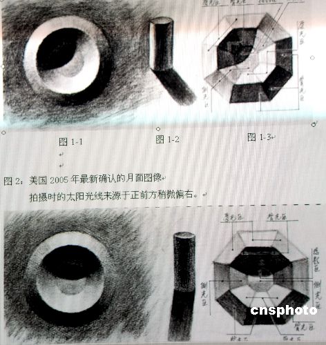 2007年12月6日,海南在京的一位畫家從光學(xué)角度找到中美兩“月亮”鮮明差別。中國嫦娥首幅月球圖像抄襲美國的傳言,在網(wǎng)上一度鬧得沸沸揚(yáng)揚(yáng),海南省畫家、超常創(chuàng)意專家于廣勝在北京,反復(fù)對(duì)照中美兩圖琢磨研究,從光學(xué)角度發(fā)現(xiàn)兩幅圖象有著“更加鮮明的差別”,6日早晨他發(fā)現(xiàn)兩幅圖像是在不同的光源下拍攝的,從另一側(cè)面有力證明了我國嫦娥傳回圖像的真實(shí)性。于廣勝說,這一證據(jù)是普通大眾不易發(fā)現(xiàn)的,但通過他所手繪的幾幅圖,即可讓普通大眾一目了然。同時(shí),凡是對(duì)光學(xué)有所研究或通曉繪畫用光、攝影和攝像用光的人們,自然明白其理。為了便于廣大讀者理解,他把地球上的環(huán)形山簡化為內(nèi)凹外凸的圓臺(tái)(圖1-1、2-1),以顯現(xiàn)不同光線來源下的不同光影效果;由此,又進(jìn)一步簡化為內(nèi)凹外凸八棱臺(tái)(圖1-3、2-3)并標(biāo)注了光線的來源和受光、測(cè)光、背光區(qū)域;同時(shí),又畫了一個(gè)圓柱體(1-2、2-2)以顯現(xiàn)不同光照角度下的不同投影方向。通過兩組手繪圖,中國與美國公布的兩張圖像在拍攝時(shí),太陽光照射月球角度明顯不同,至少左右相差42度左右。中國拍攝時(shí)的太陽光線來源于左前方,而美國拍攝時(shí)的太陽光線來源于正前方稍微偏右。于廣勝說,稍有電腦平面制作、攝影和攝像后期制作知識(shí)的人們都明白,圖片與圖片的任意組合拼接是輕而易舉的,但要想把圖片中各個(gè)圖像所有細(xì)節(jié)的光影全部改變是不可能的,“由此可見,我國嫦娥傳回的圖像其真實(shí)性是不容質(zhì)疑了。”相關(guān)鏈接:12月2日,中國探月工程首席科學(xué)家、中國科學(xué)院院士歐陽自遠(yuǎn)做客上海“文匯講堂”,對(duì)關(guān)于“嫦娥首幅月球圖像抄襲美國”的傳言作出澄清:“嫦娥傳回的圖像確實(shí)是真實(shí)的,是經(jīng)過非常復(fù)雜的拍攝、傳輸、接收、處理過程后得到的,并且與美國所拍的圖像有細(xì)微差別”。我國嫦娥一號(hào)衛(wèi)星所攝的月面圖像上,某個(gè)地方有兩個(gè)小坑,而美國2005年最新確認(rèn)的月面圖像上,同樣的地方只有一個(gè)小坑。中新社發(fā) 善平 攝