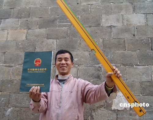12月8日,程成高在展示他發明的“帶抹砂漿機構的水平尺”。江西省樂平市后港鎮程家村農民程成高,只有小學三年級文化,但他憑借自己的勤奮和智慧,克服困難,用4年的時間,發明了集抹砂漿與測量水平與一身的“帶抹砂漿機構的水平尺”,并獲得了國家實用新型專利證書,成為當地農民的典范。另外,他的又一項發明“滾輪式清掃畚箕”正在申請專利中。中新社發 石衛明 攝