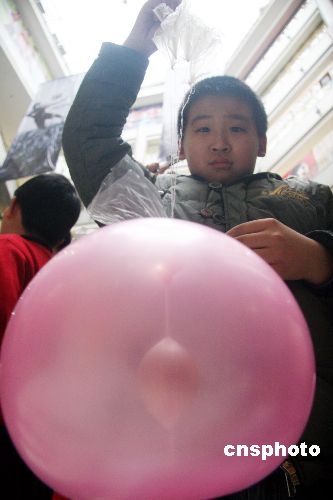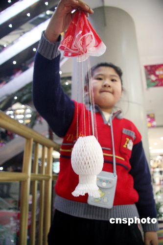 12月24日,來自沈陽市12所小學的100多名小學生在太原街的東順百貨商店的共享大廳內玩起了領人矚目的“雞蛋撞地球”的大賽。這次比賽是沈陽晚報主辦的,旨在提高小朋友們的動腦動手的能力及開發他們的想象力,讓小朋友們利用一切可以利用的設備及材料,做出各種“設備”保護雞蛋從高空中墜下撞到地面后不破損。誰使用的“設備”最輕誰就獲勝,最后有三名小同學以1.2克的同樣重量獲得并列第一名。中新社發 趙敬東 攝