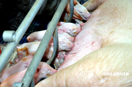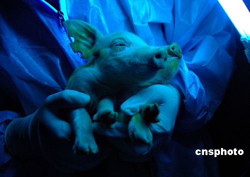 2008年1月7日12時(shí),在哈爾濱三元畜產(chǎn)實(shí)業(yè)有限公司,11頭小豬順利降生,其中2頭表現(xiàn)出明顯綠色熒光蛋白特征。當(dāng)日,東北農(nóng)業(yè)大學(xué)傳出喜訊,由該校劉忠華教授主持的中國首例綠色熒光蛋白轉(zhuǎn)基因克隆豬當(dāng)上“媽媽”,出生的11頭新生小豬其中有6頭為公豬,5頭為母豬,均健康活潑。中新社發(fā) 姚庭山 攝
