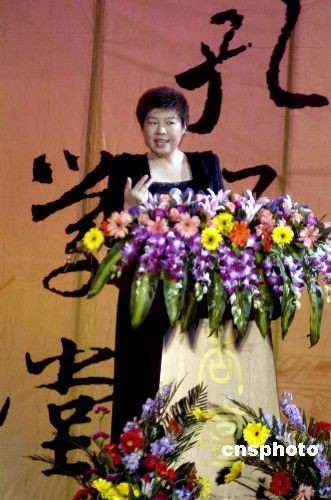 2008年4月5日晚,著名學(xué)者、北京師范大學(xué)教授于丹來到山東曲阜,作為剛剛開設(shè)的“孔子學(xué)堂”首位主講人登上杏壇的講臺(tái)。“孔子學(xué)堂”是曲阜市與中華書局面向廣大普通游客和公眾開設(shè)的文化大型講座。今后每年的4月到10月,每月都將邀請(qǐng)一名專家主講,一名專家現(xiàn)場點(diǎn)評(píng),通過和聽眾的問答互動(dòng),旨在弘揚(yáng)儒學(xué)經(jīng)典文化。中新社發(fā) 張侃 攝