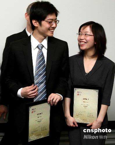5月7日,清華大學(xué)“清華-杜孟傳播獎(jiǎng)學(xué)金”頒獎(jiǎng)典禮上,獲得此項(xiàng)獎(jiǎng)勵(lì)“最佳創(chuàng)意獎(jiǎng)”的清華學(xué)生侯青楊(右)、“優(yōu)秀策劃案獎(jiǎng)”得主張棟同學(xué),分別獲得赴瑞士日內(nèi)瓦和泰國曼谷的聯(lián)合國愛滋病規(guī)劃署實(shí)習(xí)3個(gè)月的機(jī)會(huì)。這兩位清華學(xué)生將與世界各地專業(yè)人士一起為解決世界和中國可能發(fā)生的由愛滋病引起的嚴(yán)重健康危機(jī)而工作。中新社發(fā) 宋吉河 攝