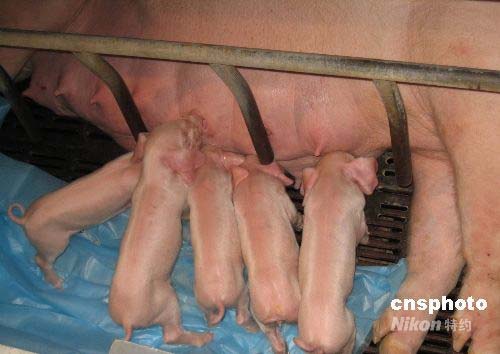 五月十七日上午,廣東省首例體細胞五頭克隆豬,在云浮新興縣廣東溫氏食品集團有限公司水臺原種豬場集體亮相。十五日下午克隆豬誕生,其中最重的一只克隆豬為一點九公斤,一胎產下五頭存活“克隆豬” 為國內之最。該“克隆豬”是溫氏集團與中國農業大學、華南農業大學合作的成果,填補了該省在該領域的空白,也是繼北京、黑龍江、上海、廣西等地之后,在中國大陸第五個擁有體細胞克隆豬的省份,是國內率先開展體細胞克隆豬研究的企業。中新社發 黃耀輝 攝
