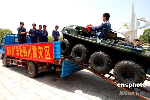 5月18日,由浙江義烏西貝文良特種車輛有限公司,捐贈給四川消防總隊的一輛“西貝虎”新型水陸兩棲全地型功能車,從義烏出發(fā),晝夜兼程趕往四川德陽,投入抗震救災(zāi)。中新社發(fā) 張建成 攝