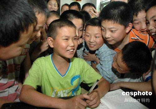 5月25日,來(lái)自四川綿陽(yáng)市火炬實(shí)驗(yàn)小學(xué)學(xué)生藍(lán)宇高興地開(kāi)始了在河北省新樂(lè)市孝德小學(xué)的學(xué)習(xí)生活。地震發(fā)生后,藍(lán)宇來(lái)到新樂(lè)市赤垢村的姨媽家。經(jīng)聯(lián)系,孝德小學(xué)校領(lǐng)導(dǎo)高度重視,決定收留藍(lán)宇,免除其全部費(fèi)用,并提供藍(lán)宇的生活費(fèi)用。中新社發(fā) 賈敏杰 攝