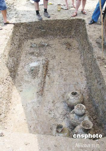 2008年7月24日,蘇州博物館考古工作者對蘇州相城區(qū)古宮黃泥村的一座西漢古墓進(jìn)行發(fā)掘,該古墓出土了一批墓葬品,共有3組6件,包括青銅鏡、陶壺、陶瓿和陶罐以及釉陶,都是兩個一對的組合,不僅器形較大,釉色更好,而且保存完好。據(jù)了解,該墓葬長3.15米,寬1.60米,被確定為西漢時期,墓葬規(guī)模以及隨葬品都超過以往發(fā)現(xiàn)的同年代墓葬,具有一定的價值。中新社發(fā) 朱子寒 攝