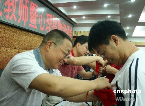 為確保地震災區學校9月1日全面復課,四川省選派非災區、輕災區的教師到災區支教。8月27日中午,宜賓市選派的13名青年骨干教師啟程到阿壩自治州茂縣開展為期一年的支教工作。圖為宜賓孔灘鎮白龍小學校教師臨行前佩帶大紅花。中新社發 陳涌 攝