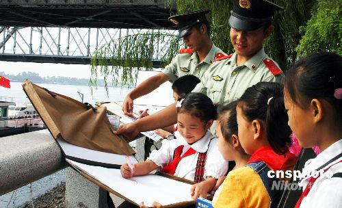 9月9日,開學伊始,又逢教師節,遼寧丹東邊防檢查站邀請駐地多所小學師生參觀中朝友誼橋,與邊防戰士一同描繪第二故鄉美景。中新社發 陳浩浩 攝