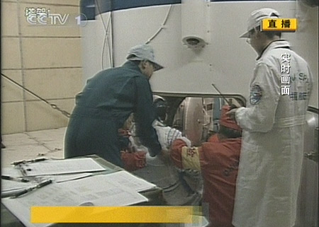 25日18時25分許,神舟七號三名航天員陸續進艙。第一名進艙的是景海鵬,第二名進艙的是劉伯明,最后,指令長翟志剛也開始進入。