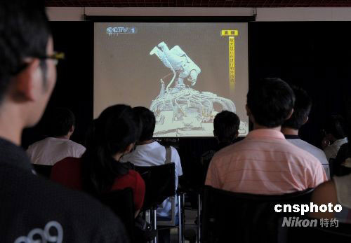 2008年9月27日下午,廈門大學學生齊聚一堂,通過投影電視大屏幕觀看神七航天員翟志剛出艙的直播電視。中新社發 楊戈 攝