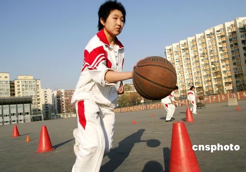 11月21日,北京中學生在體育課上積極練習籃球運球往返跑,應對中考體育考試科目變化。近日,2009年中考體育方案出臺,明年中考體育總分仍為30分,并將首次實現全市統一考試項目、統一成績評定標準、統一考試規程和統一考試時間的“四統一”。在考試項目上,男女生都必考的立定跳遠將就此退出中考,取而代之的是繞標志物15米往返籃球運球。中新社發 富田 攝
