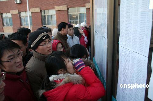 1月9日,山東濱州眾多參加碩士研究生考試的學子蜂擁到山東濱州學院考點,提前確認考場。據悉,山東濱州共有3800余名考生報名參加。1月10日,2009年全國碩士研究生入學統一考試開考,共有124.6萬名考生在全國各地應試。中新社發 郭志華 攝