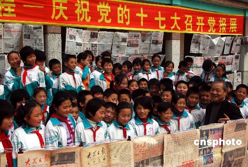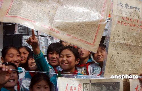 10月18日,山東省郯城縣港上鎮(zhèn)中心小學(xué)舉辦“光輝的歷程——慶祝黨的十七大勝利召開(kāi)藏報(bào)展”,共展出退休教師丁思德珍藏的報(bào)道歷屆歷次“黨代會(huì)”的各類報(bào)紙177份。黨的光輝歷程激發(fā)了師生們的愛(ài)國(guó)熱情。中新社發(fā) 房德華 攝