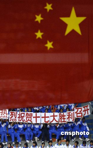 10月20日,2007-2008年全國(guó)男排聯(lián)賽的江蘇與上海男排比賽在江蘇省淮安體育館舉行,觀眾中的這幾位中學(xué)生打出了祝賀中國(guó)共產(chǎn)黨第十七大勝利召開的標(biāo)語(yǔ)。中新社發(fā) 淮安曹政 攝