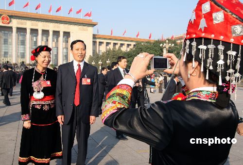 中國共產(chǎn)黨第十七次全國代表大會10月21日上午在北京人民大會堂閉幕。圖為福建代表團的畬族代表雷金花在大會堂外為代表們拍攝紀(jì)念照。中新社發(fā) 任晨鳴 攝
