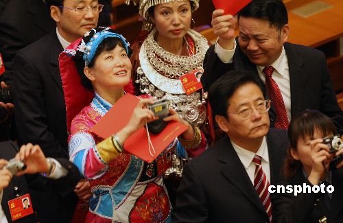 中國共產黨第十七次全國代表大會10月21日上午在北京人民大會堂閉幕,退場的貴州代表團代表與在大會堂二樓的記者相互拍照。中新社發 任晨鳴 攝