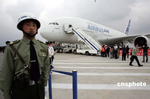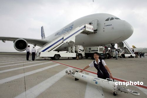 十月二十五日,空中客車A380飛機在上海浦東國際機場展示,據悉,這架生產序列號為007的A380是首度在上海公開其豪華客艙內飾。空客工作人員在此間表示,A380目前獲得十六家客戶的一百八十九架確認及承諾訂單,○八年將交付十三架,○九年交付二十五架,到二○一○年,將年產四十架,而中國南方航空訂購的五架A380計劃在○九年下半年交付。中新社發 潘索菲 攝