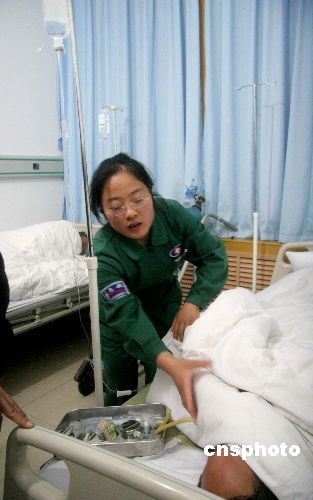 醫護人員在為獲救的船員檢查體溫。