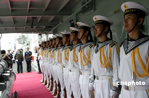 11月29日,中國“深圳”號導彈驅逐艦對日本的友好訪問進入第二天,雙方進行了高層拜訪、參觀軍艦、體育比賽等各種交流。圖為等待日本海上自衛隊參謀長吉川榮治檢閱的“深圳”號艦上儀仗隊。中新社發 朱沿華 攝