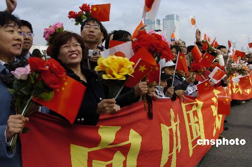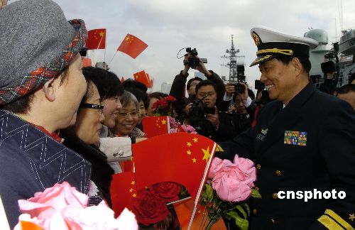 12月1日上午“深圳”號結束對日本的友好訪問返航歸國時,六百余名在日華人華僑留學生及駐日使館人員趕往碼頭送行。中新社發 朱沿華 攝