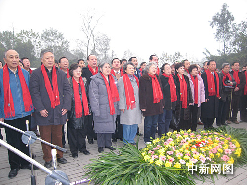 著名抗戰(zhàn)將領(lǐng)親屬今天在四川大邑縣安仁鎮(zhèn)建川博物館中國(guó)壯士群雕廣場(chǎng)緬懷先輩。圖為毛澤東女兒李敏(左起第四位),周恩來(lái)侄女周秉德(左起第五位)等出席致敬儀式。 淮黎霞 攝