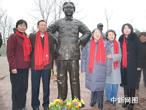 李敏(右三)、孔東梅(右一)、周秉德(周恩來侄女,右二)、周秉鈞(周恩來侄子,左二)、劉軍鷹(周恩來侄媳左一)在毛澤東塑像前合影。淮黎霞 攝