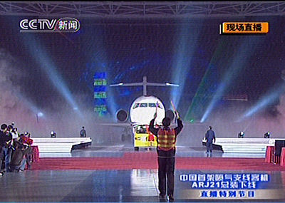 由中國航空工業第一集團公司(中國一航)自行研制生產的中國首架自主知識產權噴氣支線客機ARJ21-700飛機(中文名“翔鳳”),2007年12月21日下午在上海飛機制造廠舉行盛大的總裝下線儀式。(電視截圖)