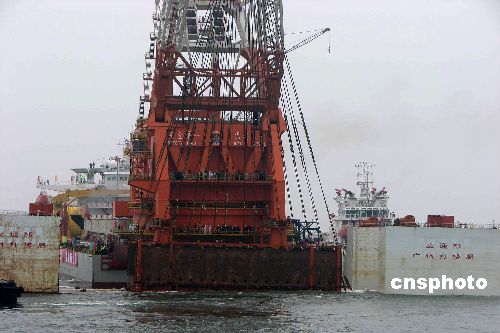圖為“南海Ⅰ號”被徐徐吊放在全潛駁輪船上。