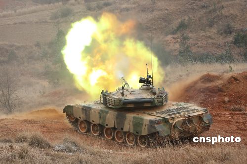 圖為訓(xùn)練中,中方坦克分隊(duì)對(duì)恐怖分子實(shí)施武力打擊。