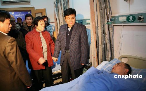 圖為十二月二十五日,國務院檢查組第十三組在國家環保總局副局長吳曉青(右一)帶領下,在江西省九江市看望九江市商業行政執法稽查支隊中隊長陳衛。