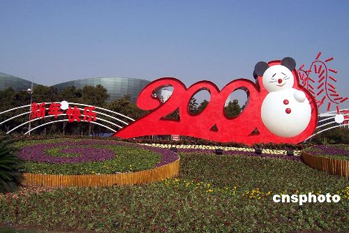 12月31日。上海浦東世紀廣場的上萬盆鮮花和大型“2008”賀年牌及其中那白色的“8”字“雪鼠”別致造型,迎接2008年到來。中新社發(fā) 周東潮 攝