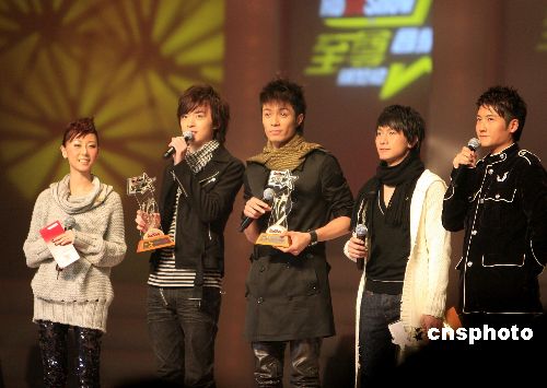 人氣歌手泳兒(左1)為洪卓立(左2)、周柏豪(左3)、陳柏宇頒發至尊男新人獎。
