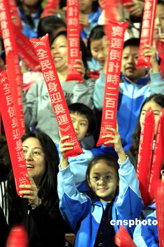 一月二十一日晚,香港舉行“全民健身迎奧運”活動,慶祝奧運倒計時二百天,特區民政事務局局長曾德成、香港基本法委員會副主任梁愛詩、中聯辦青年工作部副部長張春生等嘉賓及六千多名青少年參與活動共迎奧運。中新社發 王麗南 攝
