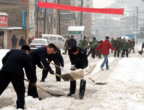 12月28日晚,江西省北部的湖口縣迎來入冬以來最大的一場雪。據悉,該縣已經連續六天發布道路結冰紅色預警信號,所有道路凝冰嚴重。1月29日,凝冰未化又遇小到中雪,通行能力受到挑戰。該縣民警、消防戰士、駐地部隊官兵、民兵應急隊員和廣大黨員干部群眾二萬余人上街清掃積雪和凝冰,盡最大努力減少災害損失。中新社發 張 俊 攝