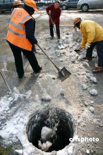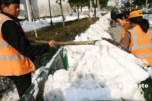 2008年1月31日,環衛工人在南京山西路廣場清理積雪。南京連續兩天放睛,街頭到處可見掃雪人,環衛工人運用各種辦法掃除公路兩邊、市民廣場和景區內的積雪。受連續暴雪影響,南京城內到處是堆積如山的白雪。中新社發 阿董 攝