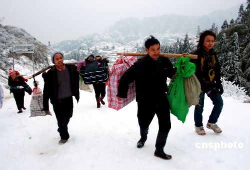 近一個月來,廣西融水縣遭受當(dāng)?shù)亟?7年來最嚴重的雨雪冰凍災(zāi)害,在海拔1470米的摩天嶺,冰雪封凍導(dǎo)致交通中斷,當(dāng)?shù)刂泄颤h員每天為過往災(zāi)民義務(wù)帶路和挑擔(dān),幫助他們翻越冰雪覆蓋的摩天嶺,安全回家。中新社發(fā) 張耀華 攝