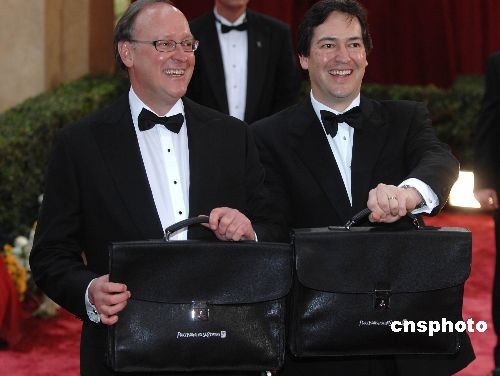 當地時間2月24日晚,第八十屆奧斯卡頒獎典禮在好萊塢柯達劇場舉行。在奧斯卡金像獎頒獎典禮開始前,美國普華永道會計事務所的兩位會計師布萊德(左)和瑞克向記者展示兩個公文包,這里裝的就是奧斯卡各獎項的最終結果。兩位會計師是最早知道奧斯卡結果的人。中新社發 張煒 攝