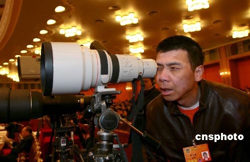 三月八日上午,全國政協十一屆一次會議第二次全體會議在北京人民大會堂舉行。著名導演、北京電視藝術中心的馮小剛委員在大會堂借用攝影記者的長焦鏡頭細觀會場。中新社發 盛佳鵬 攝
