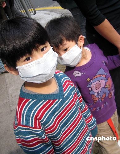 三月十四日,兩位戴口罩的香港小童在保姆的帶領下走過街頭。因多所學校學生患流感并有三名兒童因流感死亡,香港小學、幼兒園等自昨日起全部停課兩星期,以防止疫情擴大。中新社發 王麗南 攝