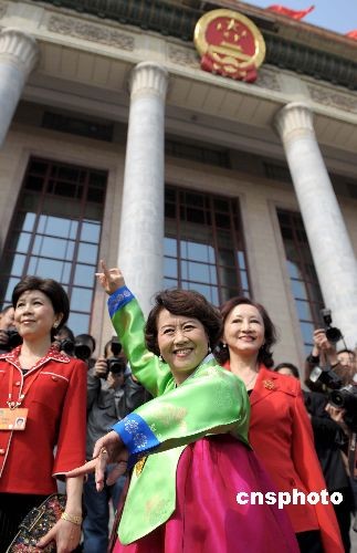 3月14日上午,全國政協十一屆一次會議完成各項議程后在北京人民大會堂閉幕。朝鮮族委員李承淑興高采烈走出會場,在大會堂前載歌載舞歡慶大會圓滿閉幕。