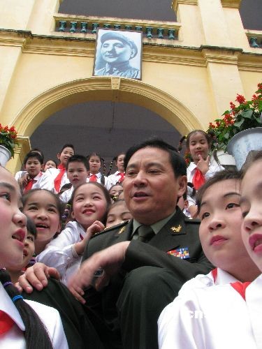 3月19日,中央電視臺“心連心”藝術(shù)團到廣西龍州縣革命老區(qū)慰問演出,圖為鄧小平的扮演者盧奇在紅八軍軍部舊址與當?shù)匦W(xué)生親切交談。中新社發(fā) 夏曉弘 攝