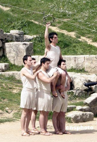 儀式上一名男祭司高舉橄欖枝桂冠,坐在其他五名男祭司肩上被抬下場,模擬古代奧運冠軍獲勝后享受眾人敬仰的榮耀。