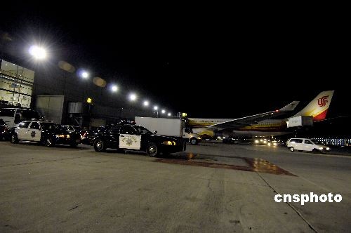 北京奧運(yùn)圣火自巴黎起飛后順利抵達(dá)美國(guó)舊金山國(guó)際機(jī)場(chǎng),美方派出警力守護(hù)。作者: 陳鋼